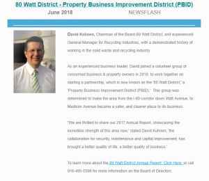 Find the 2017 Annual Report for the 80 Watt District, with details on the decrease in Crime, increase in quality of life, quality of business! For more information or support, call 916-495-5599 or email: info@80WattDistrict.com